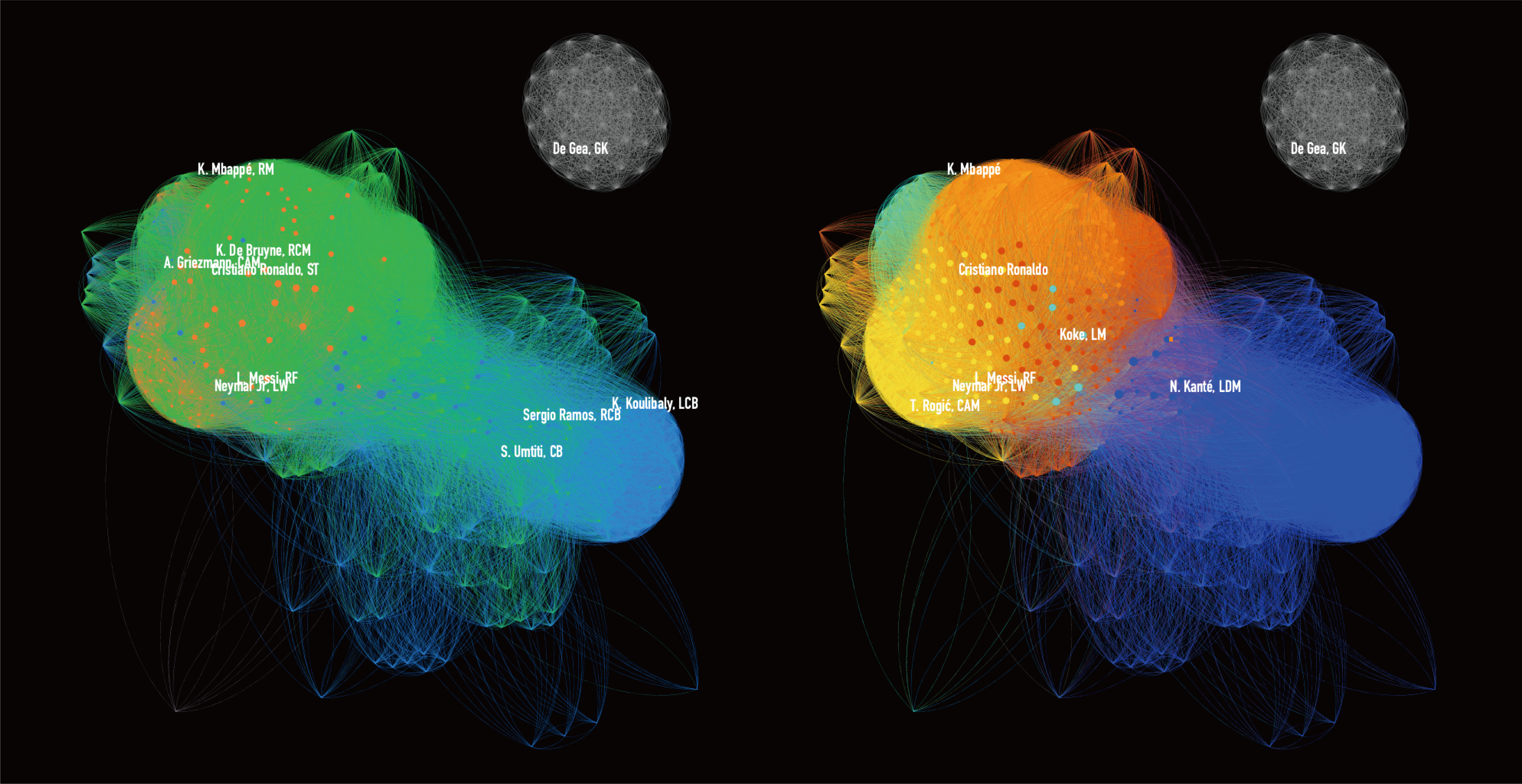 The yellow cluster is the most complex one. Although calculate this cluster separately with ForceAtlas2 helped present a better trend, the actual meaning of this cluster is still mysterious. The blue and red sub-groups show a tendency of defense (with a lot of Defend Midfielders), while the yellow cluster contains many Foward Players.
