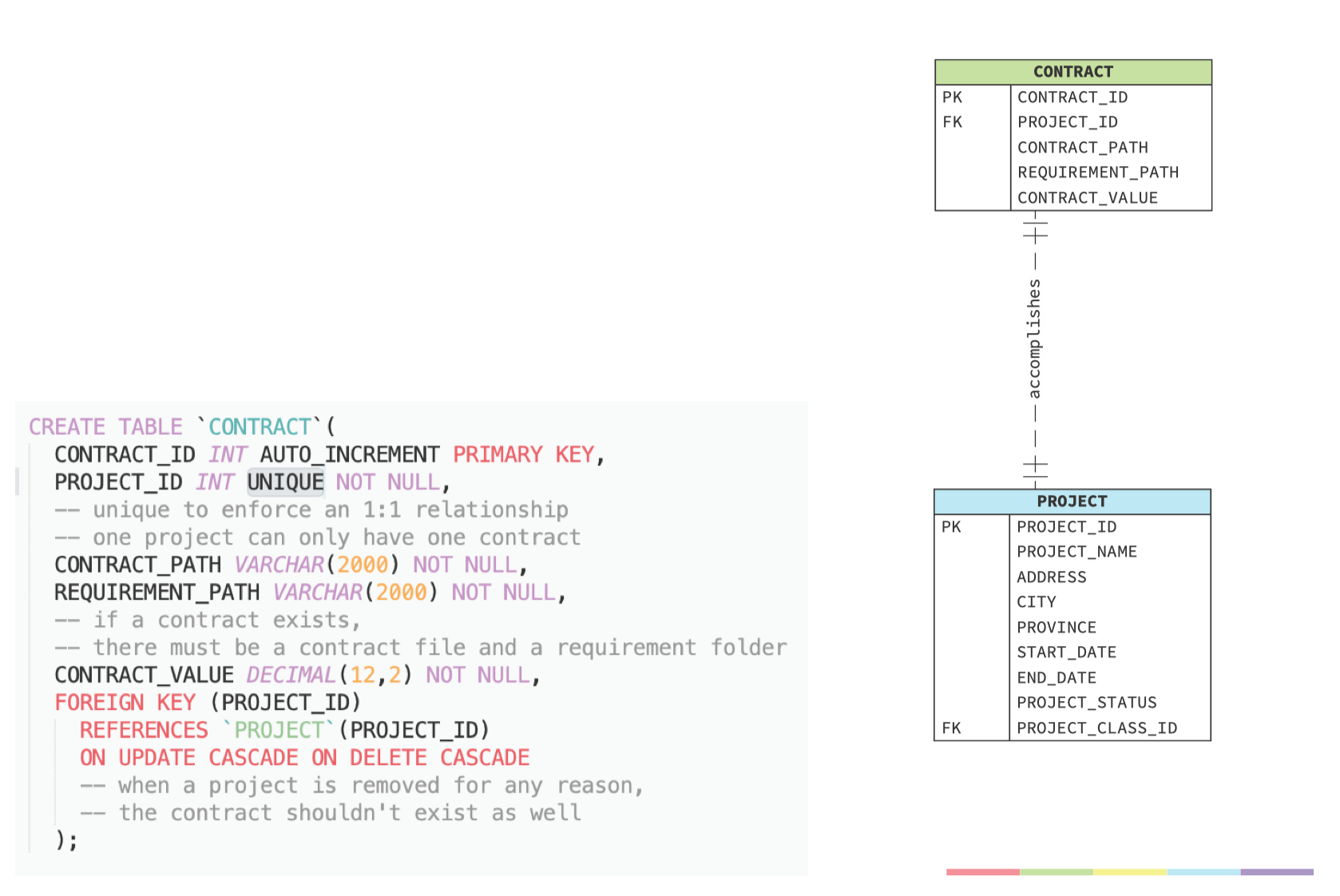Lastly, one worth mentioning design details of the database is the enforcement of one to one (1:1) relationship. As a common relationship among the concept of entity relationship datamodels, 1:1 relationship is surprisingly not naturally supported by MySQL. One work-around that I have used is to set the FK PROJECT_ID in CONTRACT entity with a UNIQUE constraint, which basically enforced each CONTRACT can correlated with only one PROJECT.