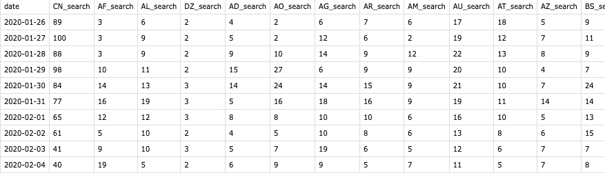 Running the above function will return a dataframe of a country’s search on ‘coronavirus’ in a three-month time span, looping an merge it will then provide a data frame similar to the COVID-19 tables.