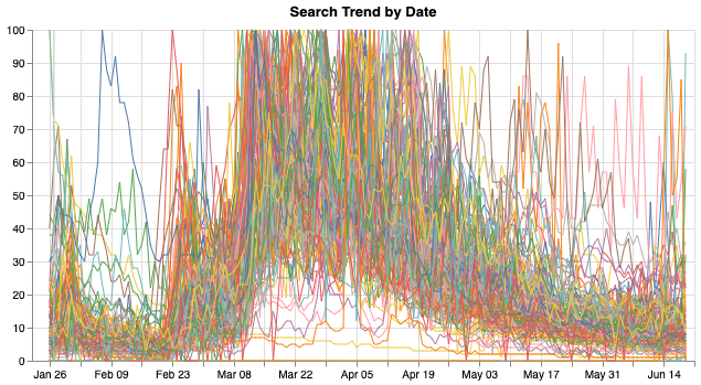 This limit raised two questions. One is simple enough, that which time span should I use for my purpose. To avoid the noise of daily patterns (more searchings during the day time while less in the night), I decided to query the past 3-month trends only. It would also make sense when I’m looking at an incident that happens across months. The other question is harder. The time span of this pandemic will certainly surpass 3-month, and then the index for two different time span will be based on two differet numbers. In other words, the tables downloaded on different time cannot be simply concatenated together but requires some calculation in front. Therefore, it would be reasonable to separate the process into two parts: get the 3-month searching data, and then update it with some certain formula.