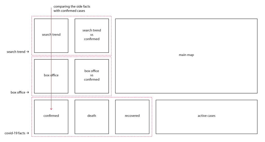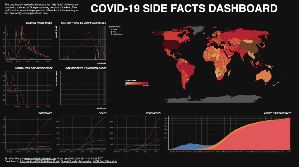 The other facts that have come to my mind also include traffic reduction, certain websites’ click ratio, and searching trends in different countries. However, not all of these data can be used to compare countries on a worldwide scale. Moreover, the scope of this project is also a limit. In the end, a dashboard showcases two “side facts” of the current pandemic (i.e. the searching trends and the box office performance) has been created, which can be used to see how people from different countries reacting to the consistently updating epidemical data.