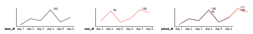 However, as being stated, this function can only cover the last three months, and some calculations are needed when the total duration is longer. The first ‘three-month’ data I got from Google Trend was between Januarary 26th and April 24th (it’s 90 days actually), which is being used as a base search trend data frame in the calculation (base table). And when I run the exact same function on the next day, a new table will return with the first days (Jan 26) excluded and a new last day (Apr 25) added. Our goal is to left join the two tables and to make sure the search trend index won’t be messed up during the join.